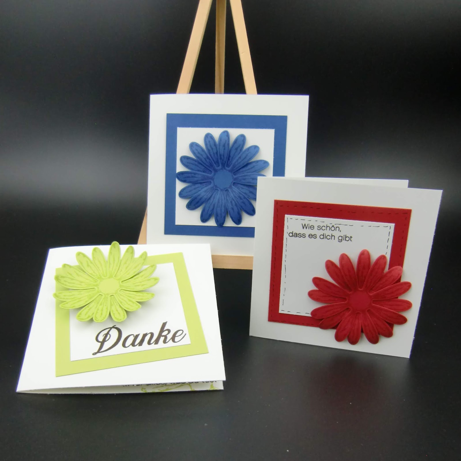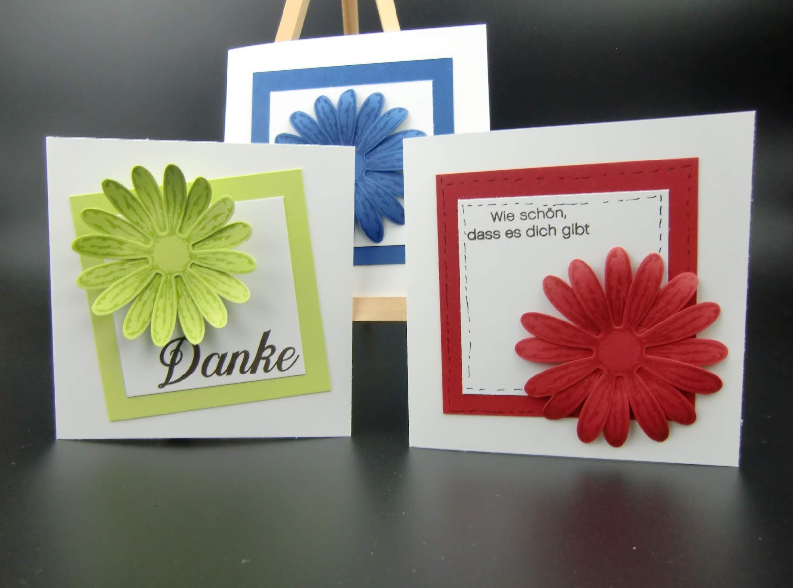 Gestaltet habe ich dieKärtchen in Limette, Blaubeere, Glutrot und Espresso. Alle verwendeten Stempel sind aus dem Set Gänseblümchengruß.