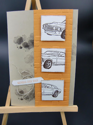 Die Idee für diese Karte habe ich mir hier gemopst. Verwendet habe ich das Stempelset Werkstattworte und Klitzekleine Grüße. Ich kann euch verraten, dass beide Stempelsets weiter im neuen Jahreskatalog erhältlich sein werden. Den Mauer-Prägefolder gibt es auch weiterhin, er ist ein absolutes Basic und wirklich vielseitig Einsetzbar.