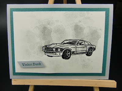 In dem Stempelset ist ein Hintergrundstempel – ich glaube er soll Öl-Kleckse daarstellen – in Schiefergrau habe ich immer den ersten und zweiten Abdruck verwendet. Der Mustang ist in schwarz embosst.